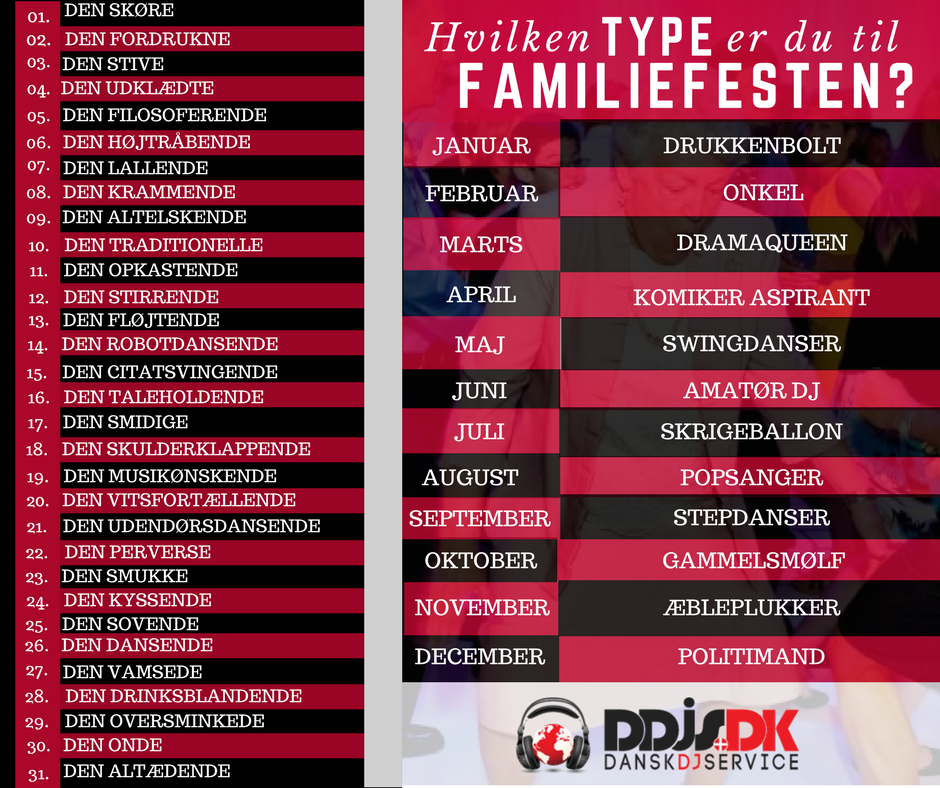 Vi har lavet denne sjove grafik – lad din fødselsdato fortælle dig hvilken type du selv er til familiefesten.Familiefest