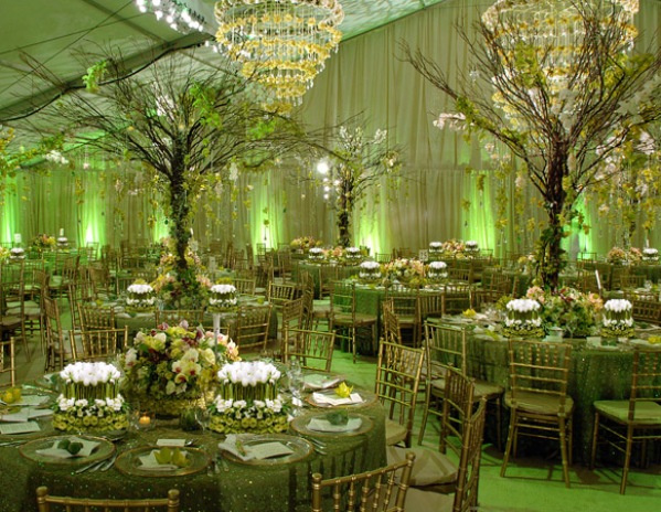 Grøn kan bruges på nogle meget kreative og smukke måder ved at inddrage grene/træer sammen med uplights og loungebelysning.